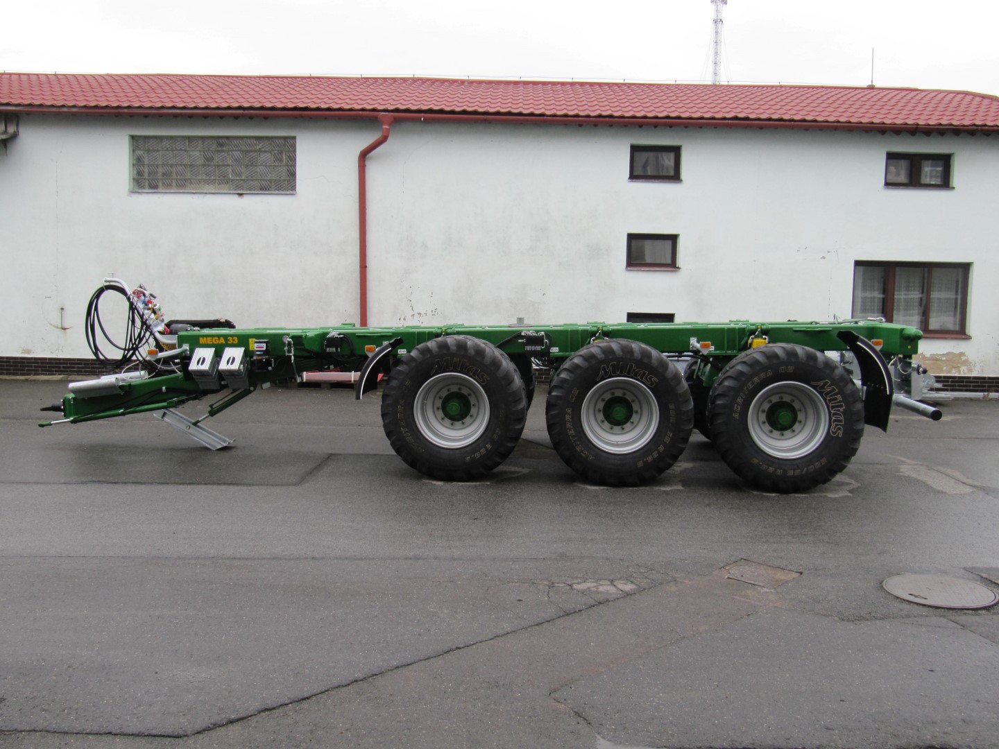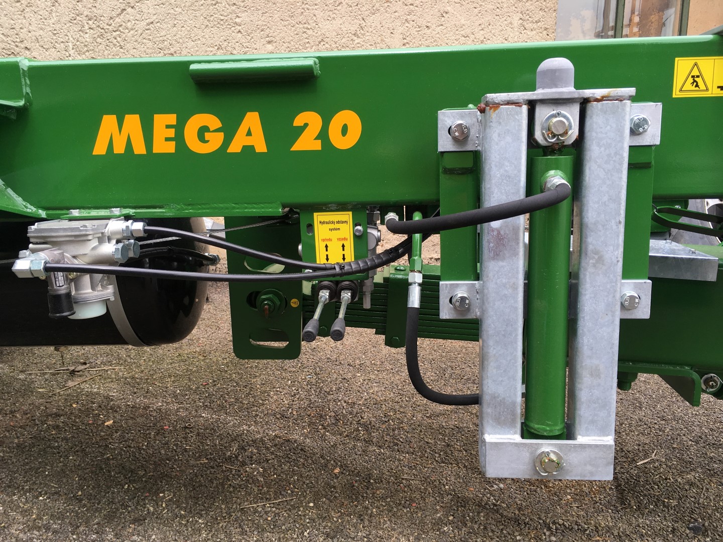 Der Fahrgestell MEGA33 kann mit hydraulisch gefederten Achsen bestückt werden. Diese Variante der Federung bietet die Möglichkeit, die Fahrgestellhöhe einzustellen, deshalb ist beim Wechseln des Aufsatzes kein hydraulisches Abstellsystem notwendig. Zusätzlich kann die Lichthöhe für Feld- und Straßenverkehr geändert werden. Die hydraulische Federung zeichnet sich durch ausgezeichnete Fahreigenschaften insbesondere in hügeligem und zerschnittenem Gelände. Der nächste unumstrittene Vorteil ist die Möglichkeit, die Vorderachse bei der Fahrt ohne Beladung hoch zu heben, womit die Reifen geschont werden können.