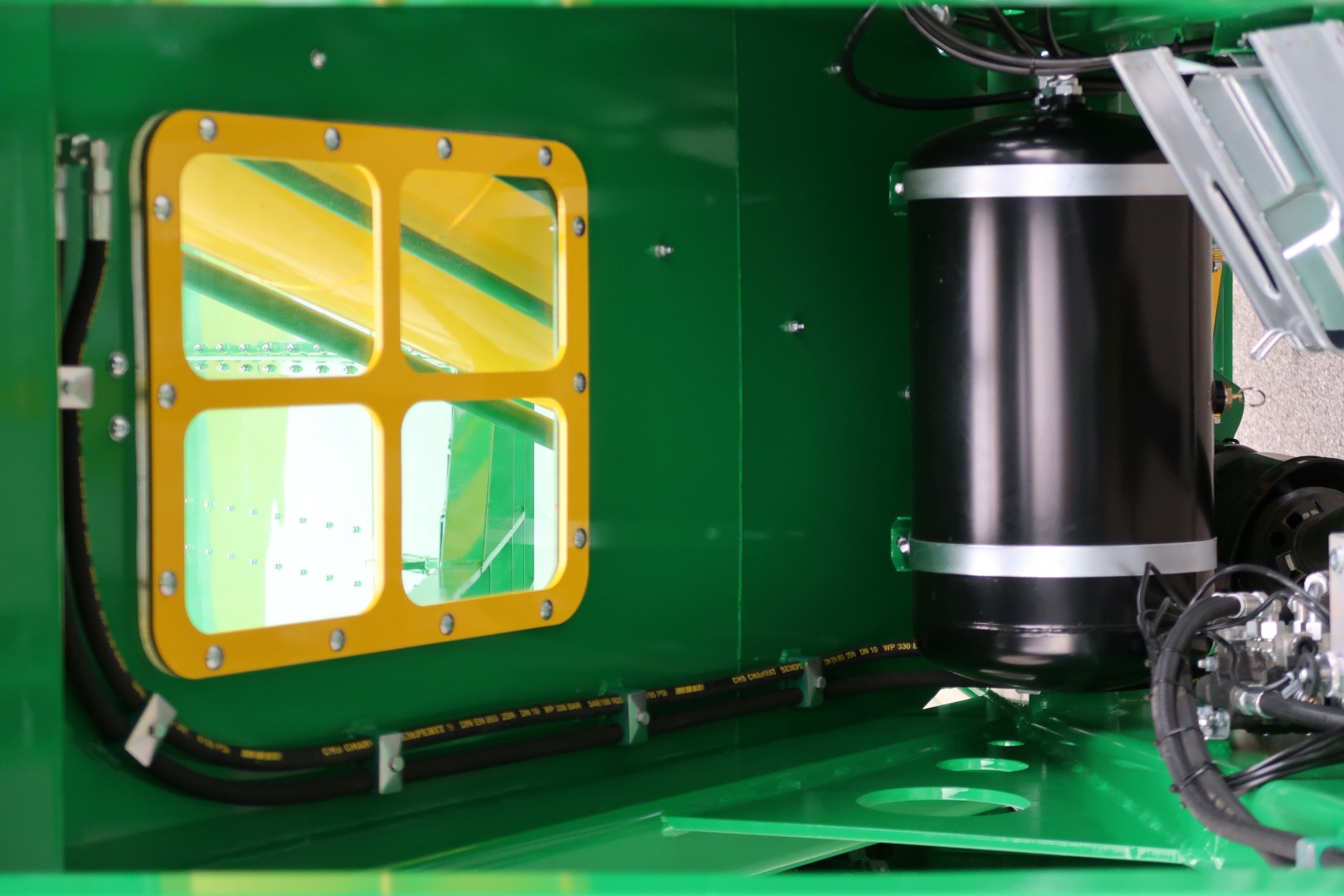 In front, the vehicle is equipped with a transparent window to check the filling and intrusion of foreign objects.