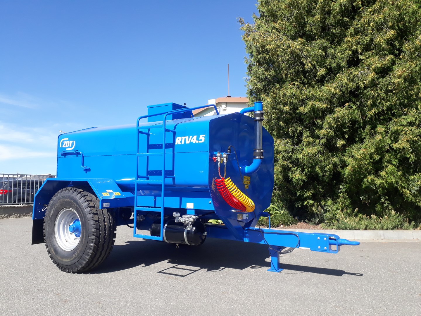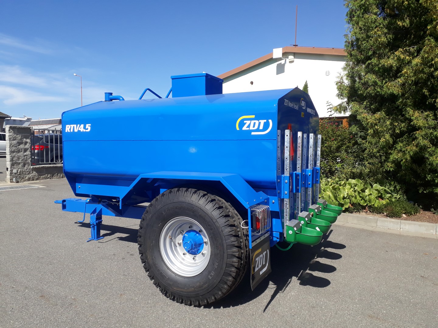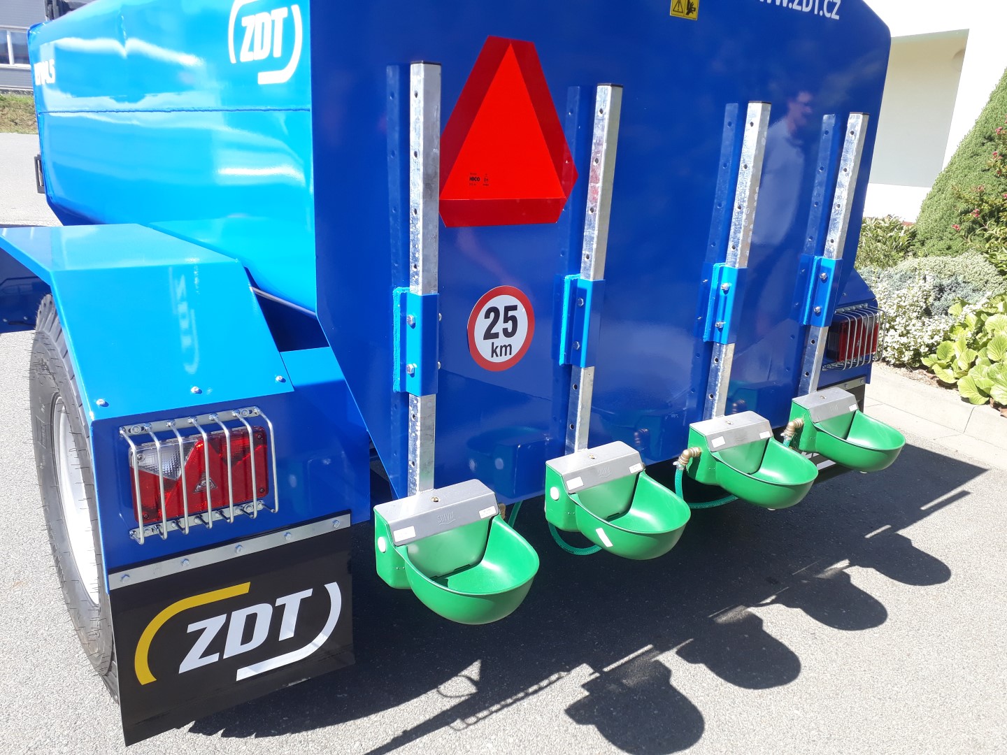 The tank is made of steel sheets, treated with both inner and outer paint. On the rear part of the trailer are placed 4 drink sinks. Those are available to set in appropriate height, depending on various animals. There are also two supporting jacks, keeping the trailer in level. The tank is available in single size and equipment.